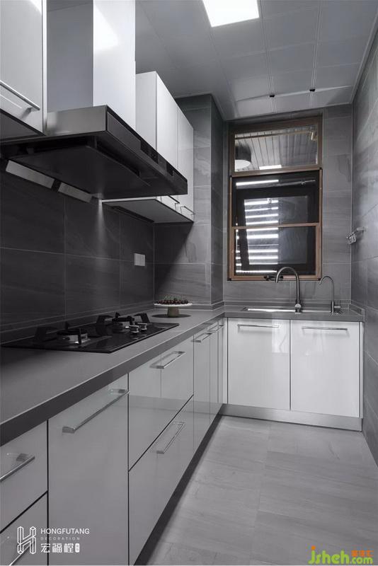 原始廚房空間有限,作為中廚使用,灰色波紋瓷磚的使用,增添空間紋理感,冷色調(diào)的運用綜合了廚房的燥熱感,從實用性方面來說,更耐臟。