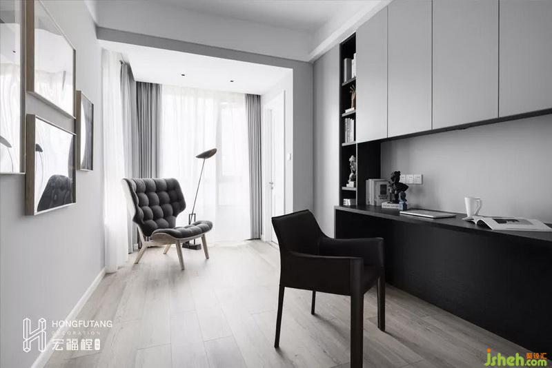 書房閱讀區(qū)域由原始陽臺擴大而來,增設(shè)書房的視野,改善書房采光條件。在躺椅上選用舒適的閱讀姿勢,疲憊時眺望遠方,即使忙碌工作也不能忽略眼前的風(fēng)景。