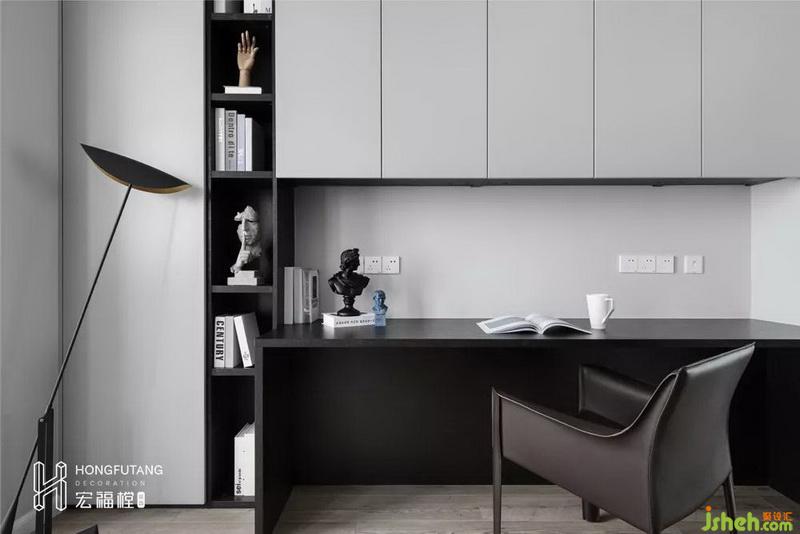 書房更顯業(yè)主的職業(yè)特征,邏輯清晰,條理清楚。書柜的設(shè)計選用封閉式,將書籍資料整潔排列,隱藏于柜門之中,便于業(yè)主在解題時思路不會受外界環(huán)境的打擾。