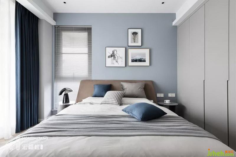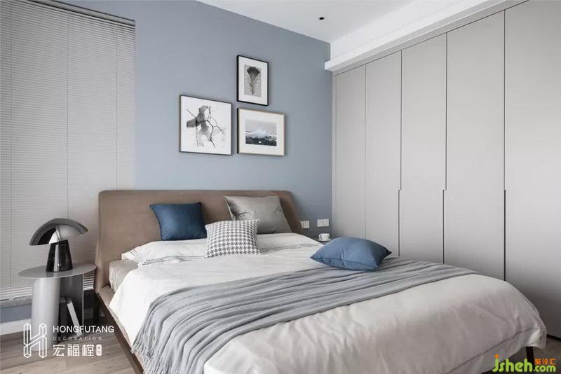 室內(nèi)設(shè)計師在主臥延續(xù)客廳色彩,月光藍帶來的沉靜感,使得主臥空間更加純凈、放松。