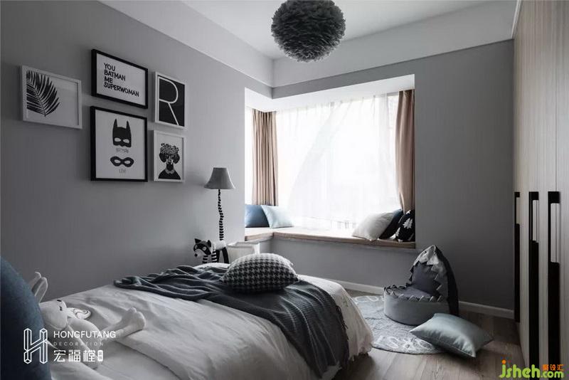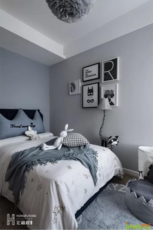 室內(nèi)設(shè)計(jì)師在兒童房延續(xù)客廳主色調(diào)選用月光藍(lán)做為主色調(diào),搭配茶灰色窗簾,空間更加溫潤(rùn)。冷靜不浮躁,綜合兒童房過(guò)于喧鬧的氛圍。