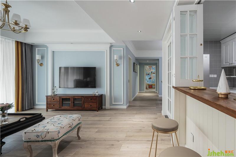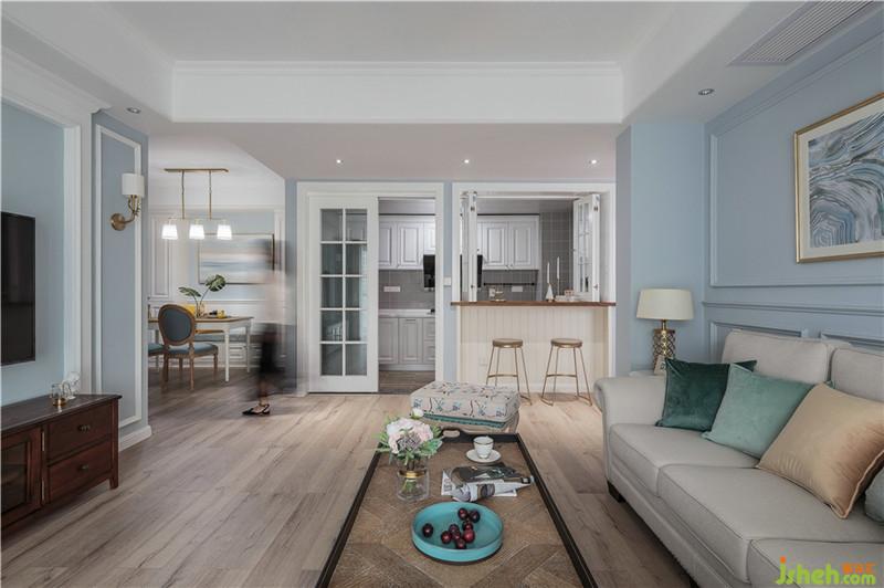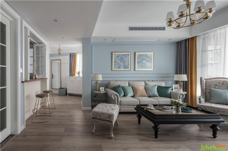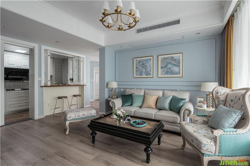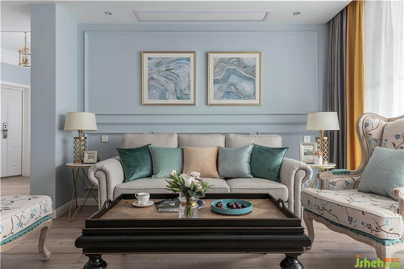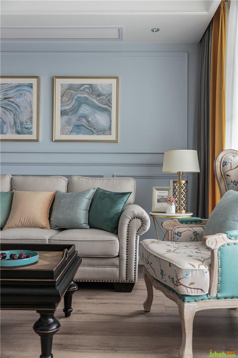 客廳墻面選擇將藍(lán)色綠色色彩純度降低,明度中度,家具配以各類同色系藍(lán)色綠色豐富空間色彩層次,以黃色、橙色、奶咖色、咖色軟裝作為互補(bǔ),讓空間更為和諧,冷暖結(jié)合,色彩搭配更加靈動(dòng)。