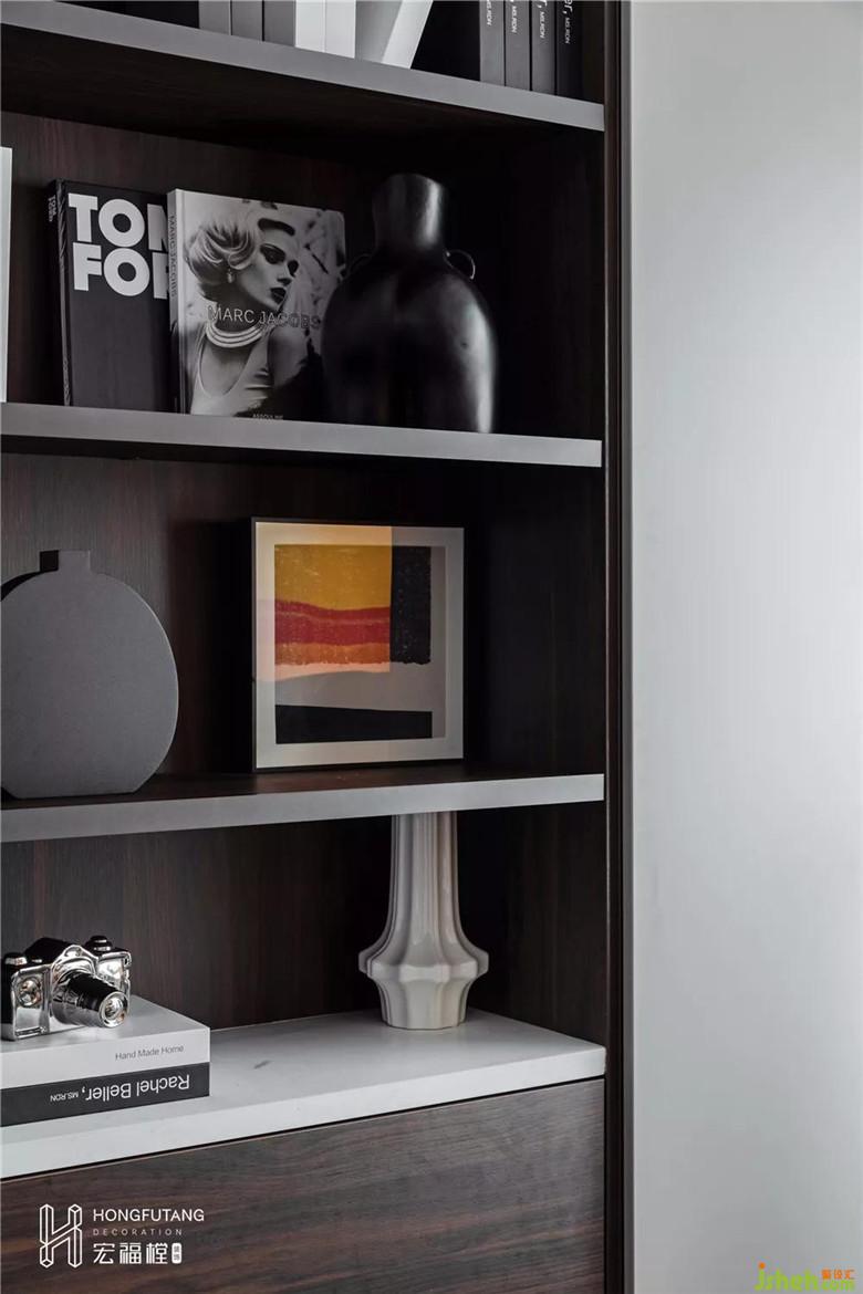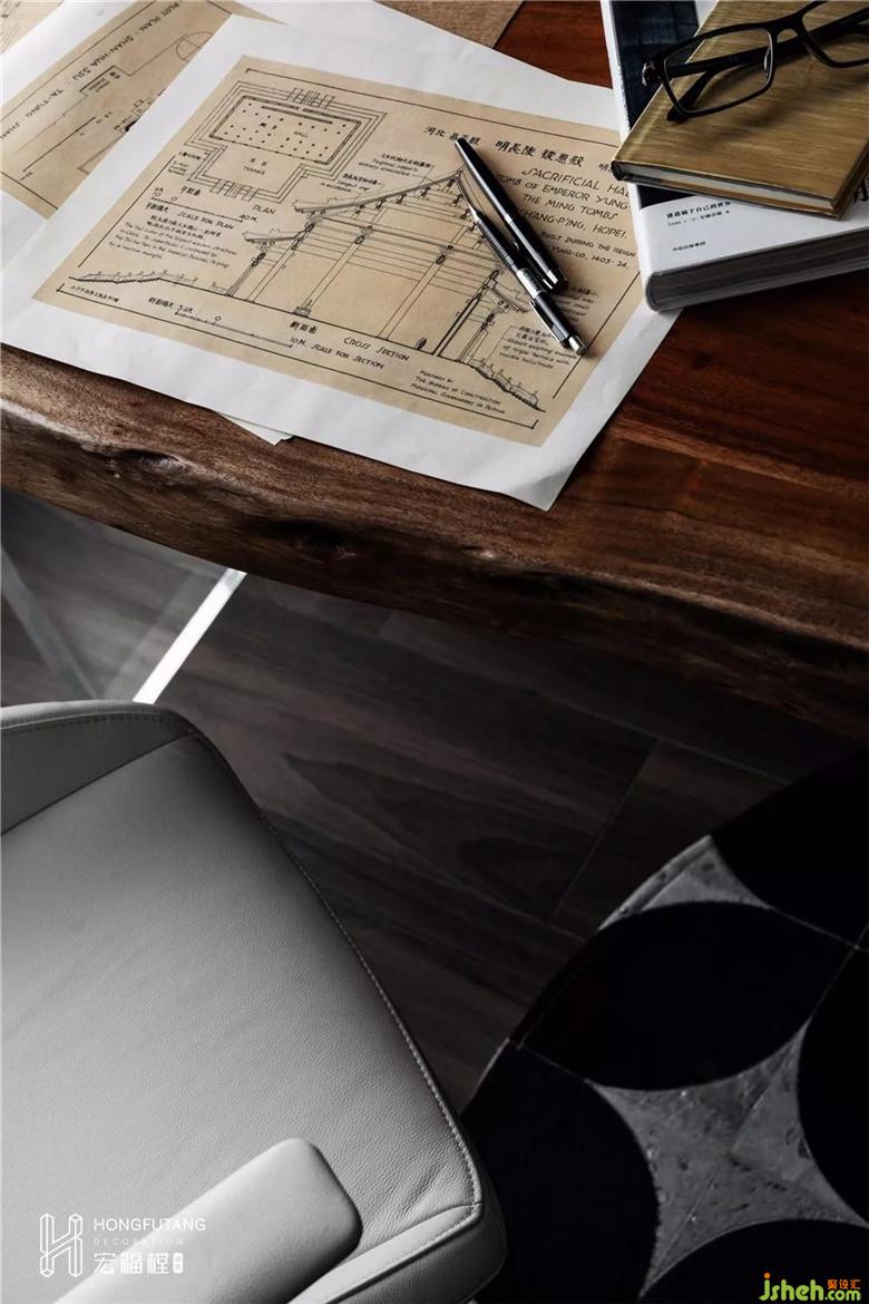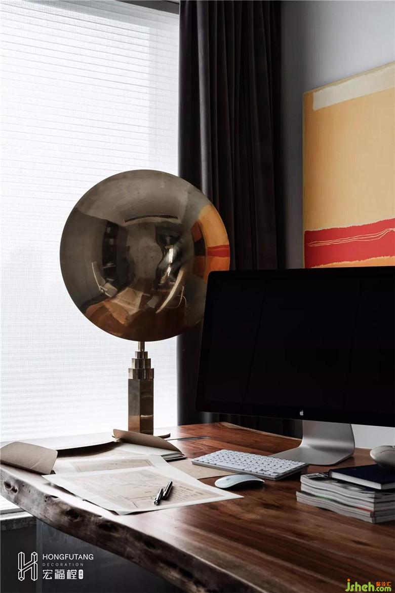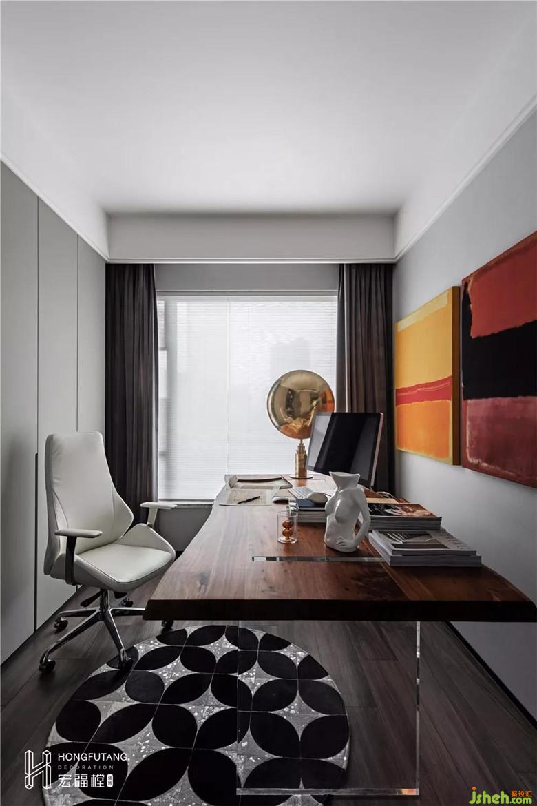書房,它給人一種既深思熟慮又不失時尚的感受,丹麥黃銅臺燈、黑白幾何的牛毛地毯、羅斯科經(jīng)典作品相互之間的疊加,色彩的交集,在高級灰空間的襯托下令人眼前一亮,令整個氛圍更富有藝術(shù)氣息。超大的工作臺,采用亞克力支腿設(shè)計,充滿了構(gòu)成感,解放空間視覺,滿足工作臺面足夠大的需求的同時,讓空間更加的輕透。