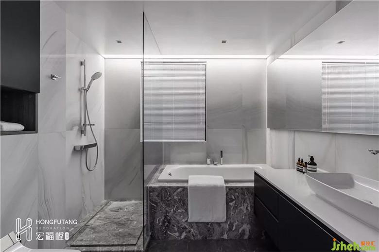 主衛(wèi)墻體向主臥移動20cm,擴大主衛(wèi)空間的同時,滿足淋浴、浴缸、馬桶、浴室柜四個功能,干濕分區(qū)、壁掛式馬桶都是節(jié)省和清潔空間的優(yōu)秀手段。當(dāng)空間容納的物件變多時,簡單方便成為了最佳的呈現(xiàn)方式。
