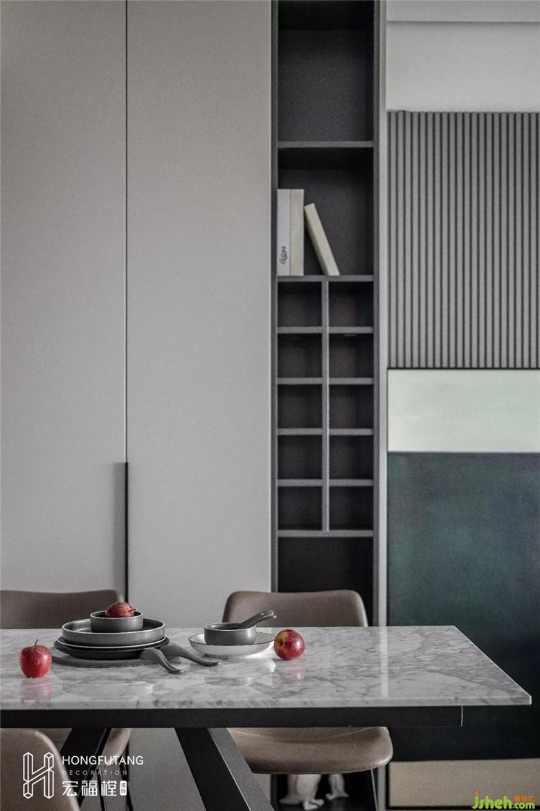 餐桌后方的墻面立柜式的設(shè)計,不僅僅增加了空間的條理性,在將儲物空間變得實用且井然有序起來。封閉式和開放式的柜格設(shè)計,保證了儲物的隱蔽性及美感性,搭配一些特別的裝飾物,傍晚時分亮起一盞微光,微醺的氛圍就更加濃厚了。