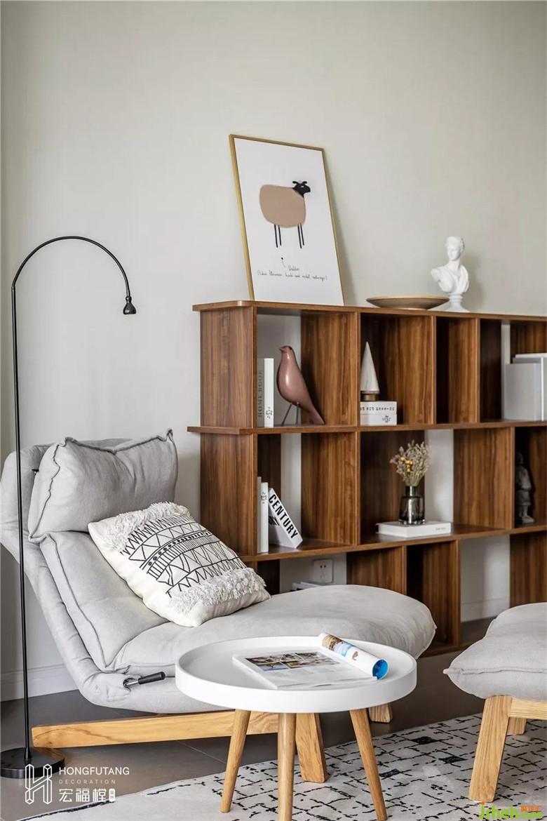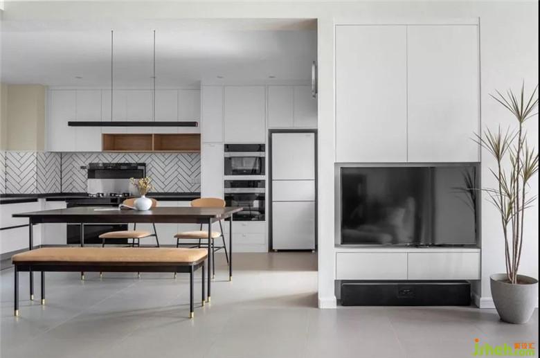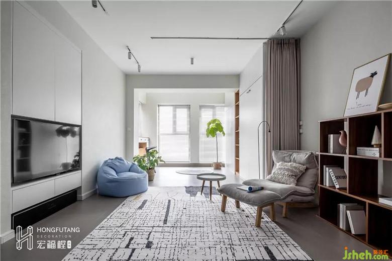 整體設(shè)計(jì)以白色為主調(diào),加上原色木質(zhì)點(diǎn)綴,舒適放松。摒棄了傳統(tǒng)客廳電視方位的打造,電視與墻面收納設(shè)計(jì)完美融合。