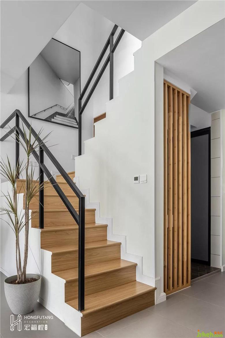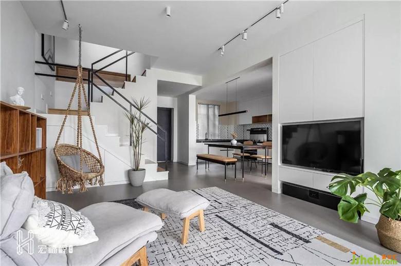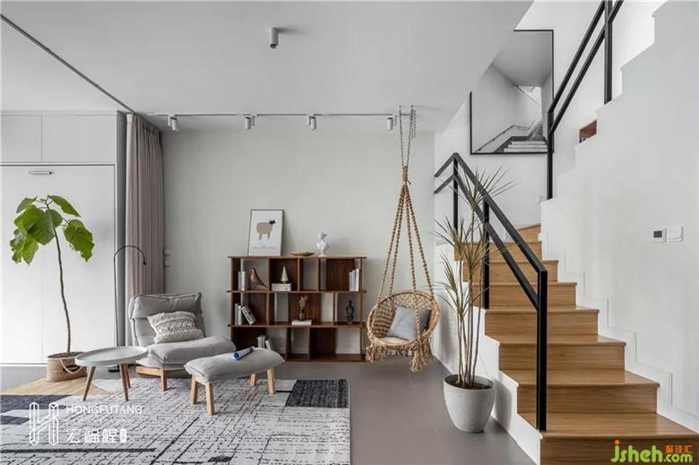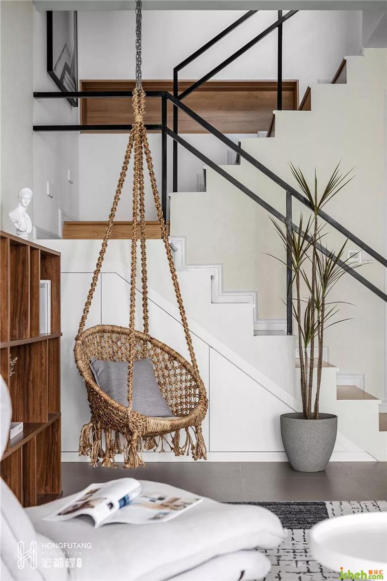 設(shè)計(jì)師改變了原始樓梯方向增大客廳空間面積,同時(shí)樓梯下部增設(shè)收納處。秋千、綠植為靈動(dòng)元素,調(diào)和了空間的靜謐。