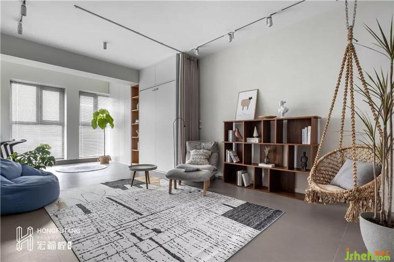 簡易的舒適分離式沙發(fā)+隨手可觸及的開放式書柜+可供孩子玩樂的秋千,大大增加了父母和孩子共處的時(shí)間。