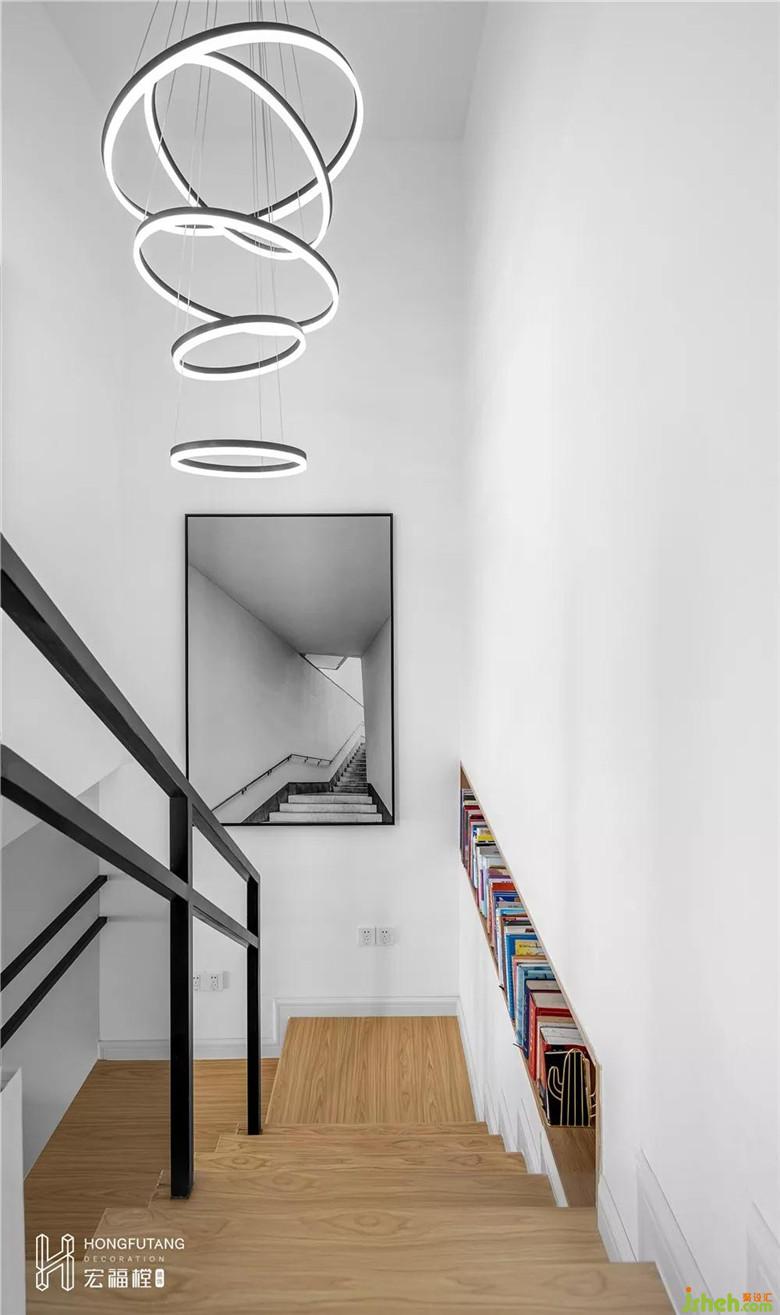 對樓梯的空間進(jìn)行了簡單一些修飾,呈現(xiàn)出一種活潑又富有創(chuàng)造力的藝術(shù)美學(xué)氛圍。拐彎處的小書柜設(shè)計(jì)讓陪孩子讀書的時光賦予更多的能動趣味性。