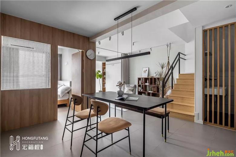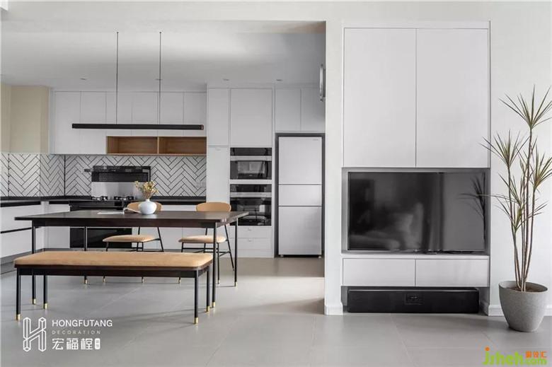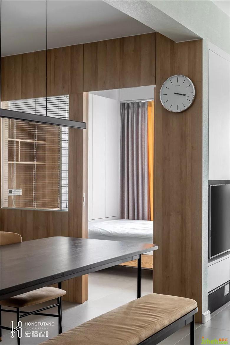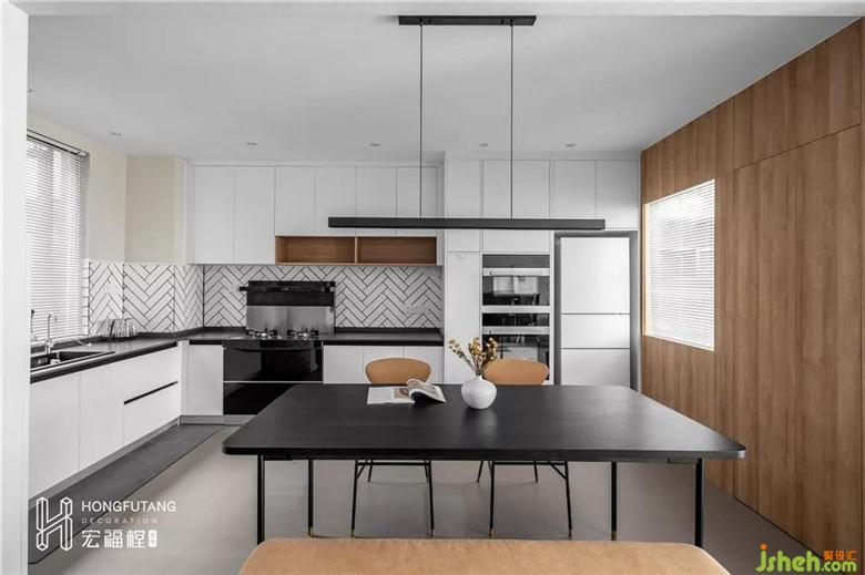 餐廳與廚房在同一空間內(nèi),面積充裕。設(shè)計(jì)師拆除原獨(dú)立廚房墻體,借用了一些次臥面積,合理布局廚房空間,使得廚房視野更加開闊,滿足LDK一體化。