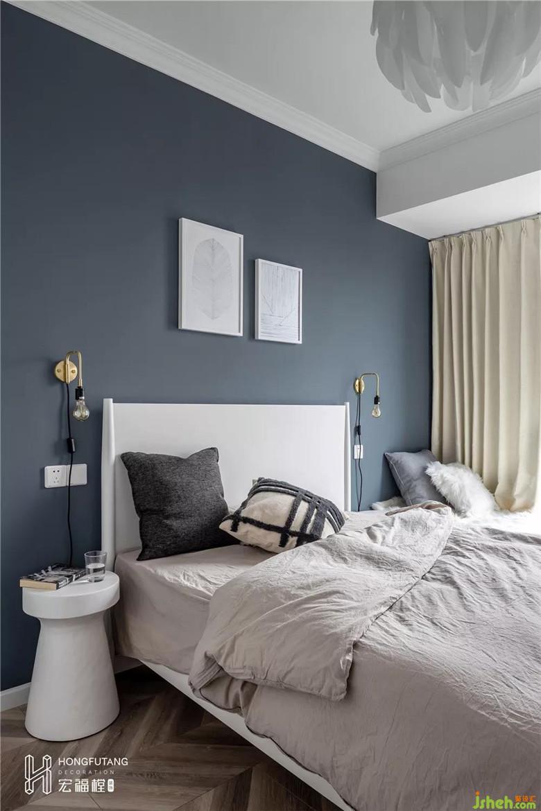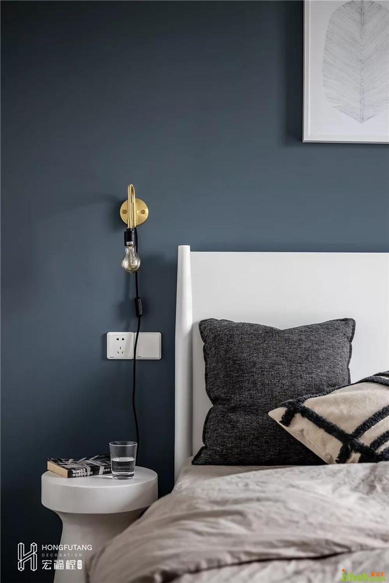 主臥以融入的藍(lán)色調(diào)來純粹靜謐的睡眠氣氛,棉麻質(zhì)地的生活用品與木質(zhì)床頭柜的融合巧妙的讓空間回歸自然本身。