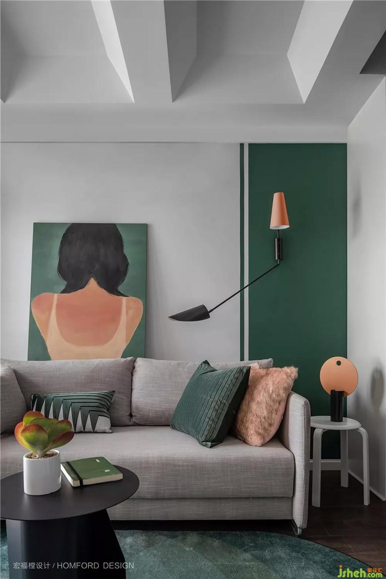 整個(gè)空間以白色、灰色、墨綠(她喜愛的顏色)為主,藕粉、低飽和橙色作為點(diǎn)綴,采用無主燈設(shè)計(jì),幾何石膏造型吊頂。