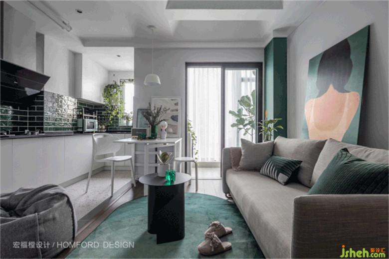 因女主做飯時(shí)間少,封閉廚房改成了開放式,光照可從廚房直接穿透到餐桌附近,加大了空間的明亮感。配上幾顆綠植,像極了一幅日光下的綠色盛宴。
