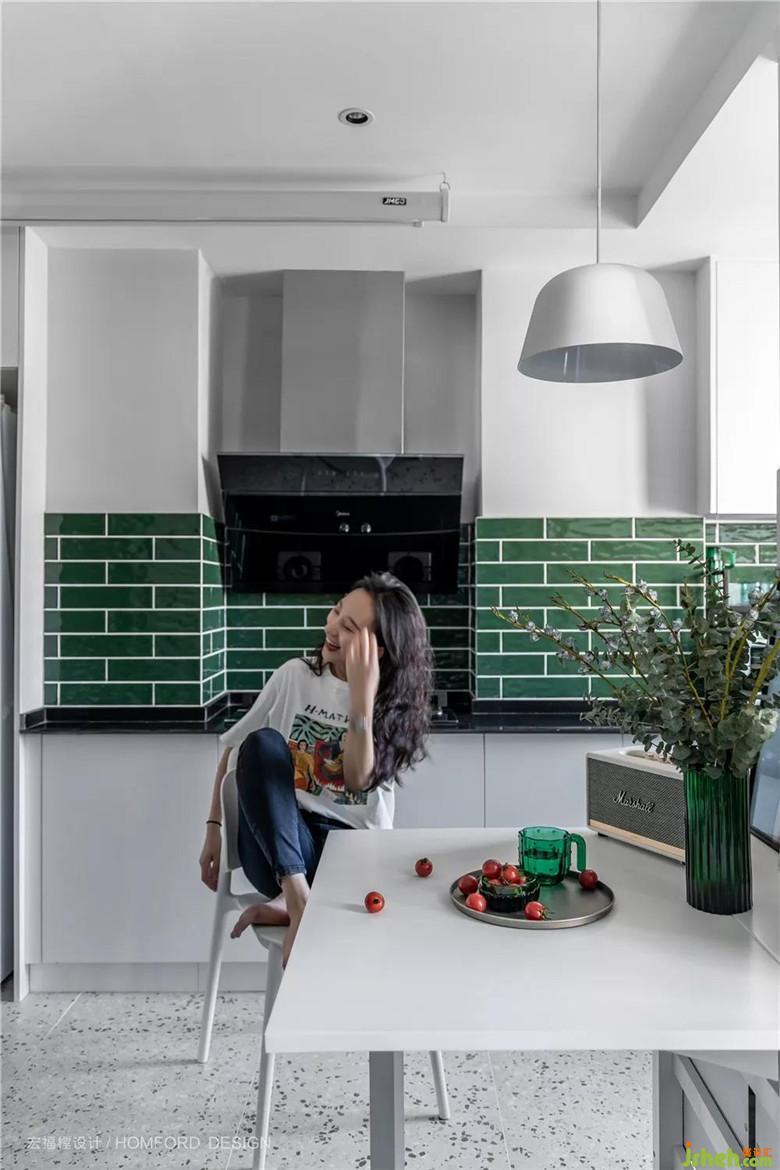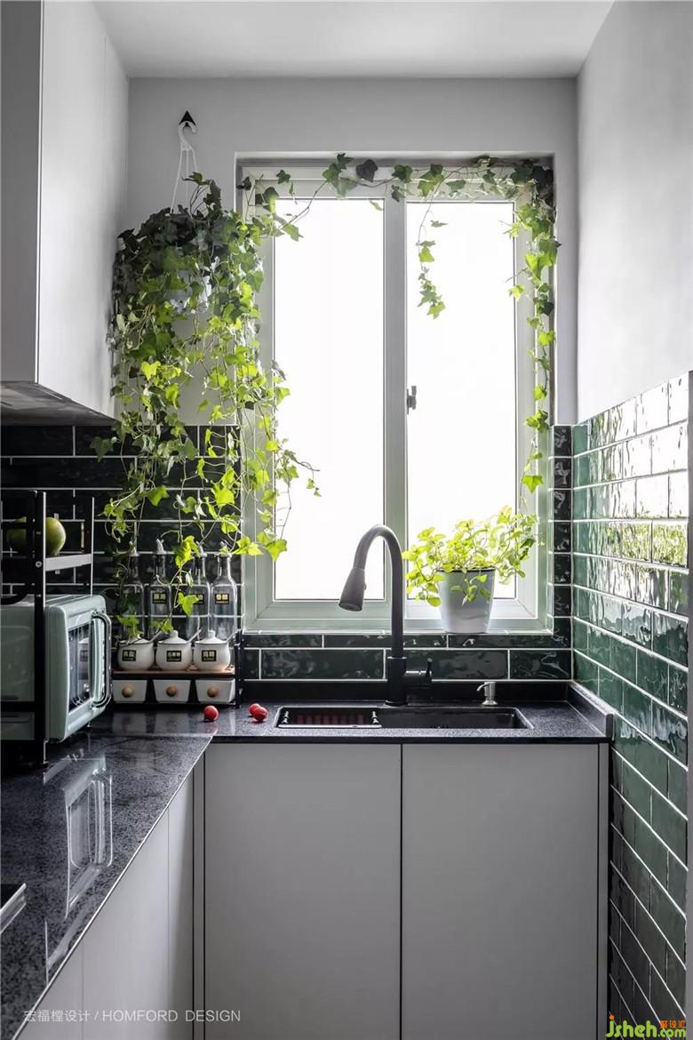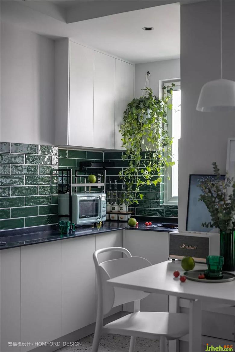 容易接觸到油漬的地方采用墨綠色磁磚鋪貼,非常利于有一點(diǎn)懶懶性格的她偶爾的簡(jiǎn)單打掃。