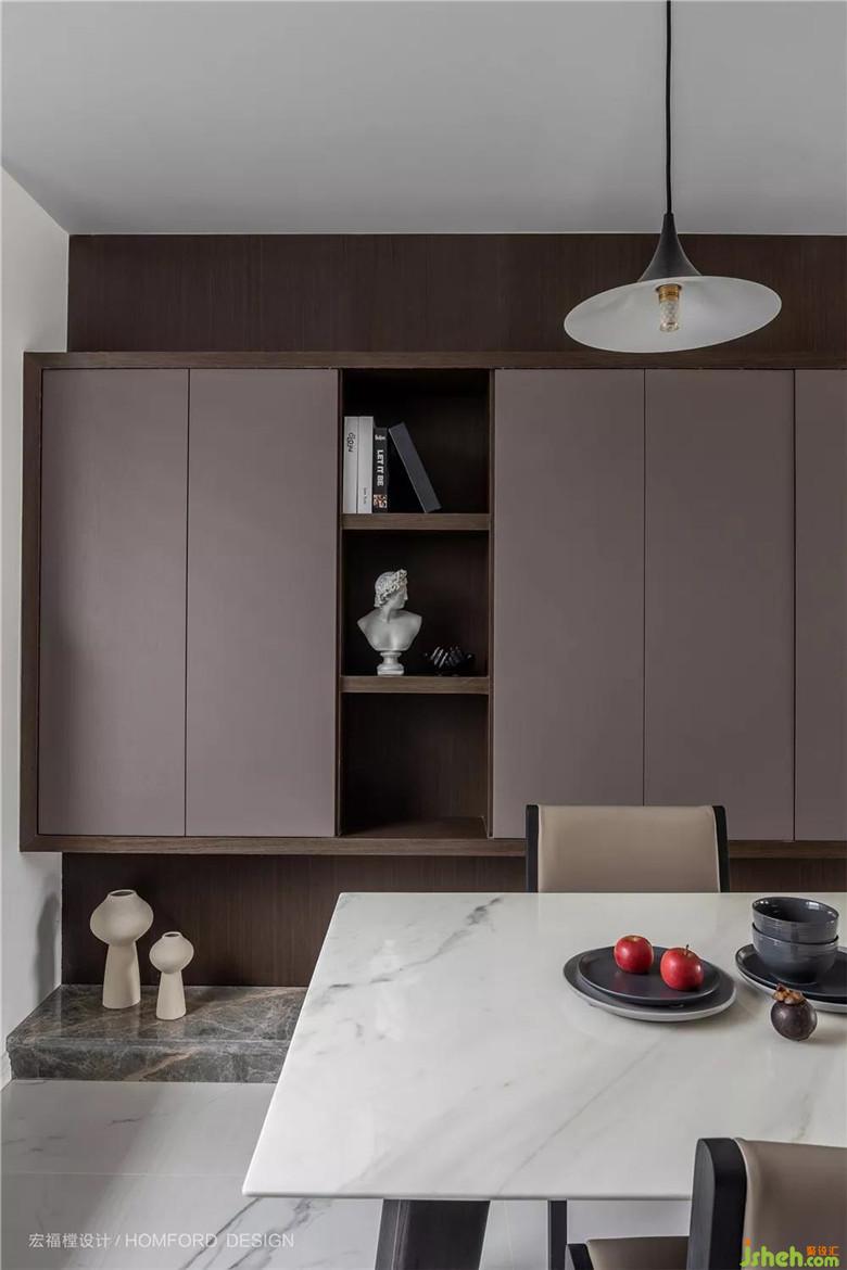 一側的吊柜顏色與材質也與客廳相互呼應,在滿足收納需求的同時也是一件可供欣賞與閑時擺弄藝術品的區(qū)域。