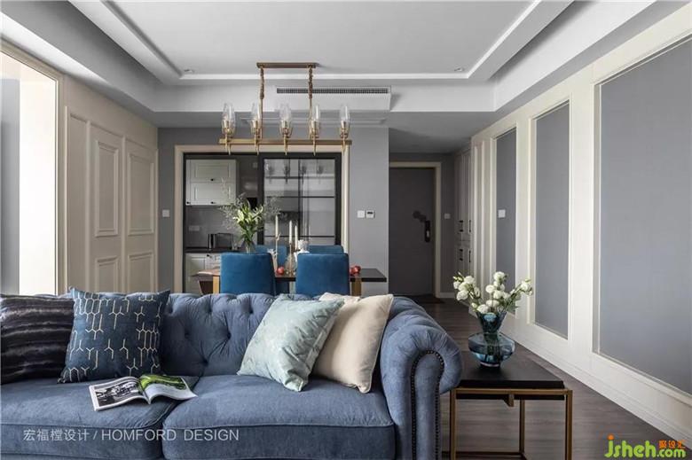 空間色調(diào)簡約、硬朗。乳白和灰色營造柔和舒適的氛圍,藍色帶來神秘、深邃和含蓄的空間感受。