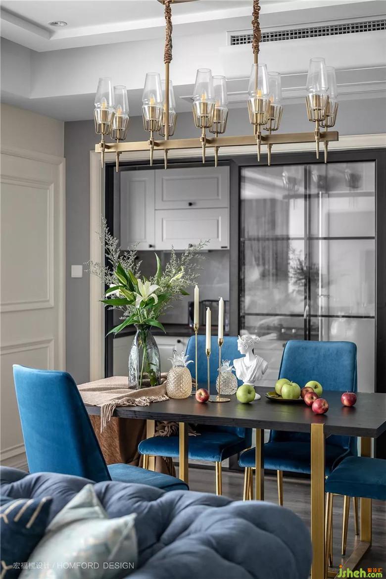 藍色麂皮金屬座椅呈現(xiàn)出后現(xiàn)代視覺與觸覺的完美結合,在色彩上為就餐氣氛帶來趣味和動感。