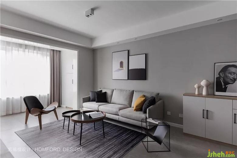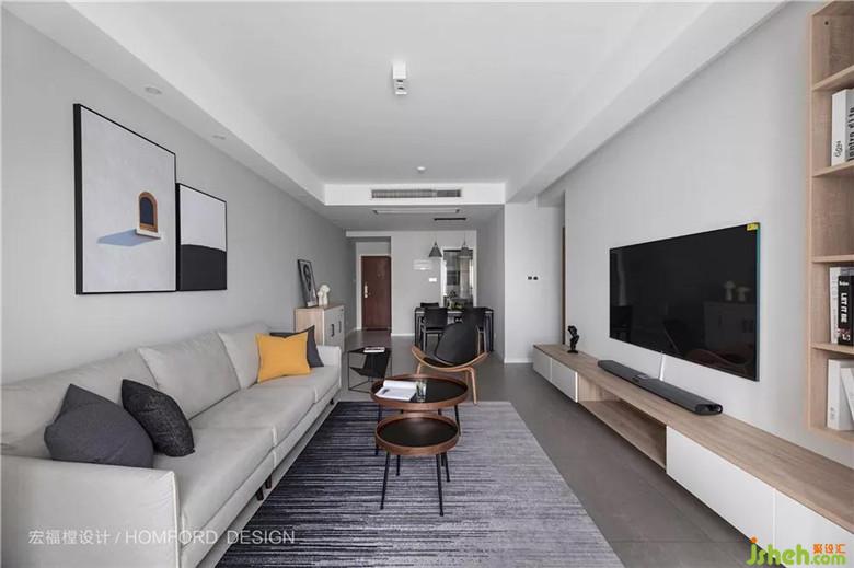 餐廳與之相連,四周的簡易吊頂在視覺上拉長了整個房間的動線。良好的采光加上灰白色墻面色彩讓房屋明亮通透。