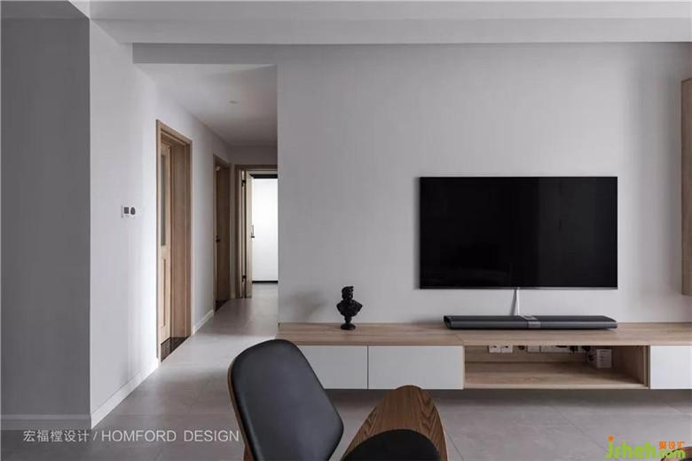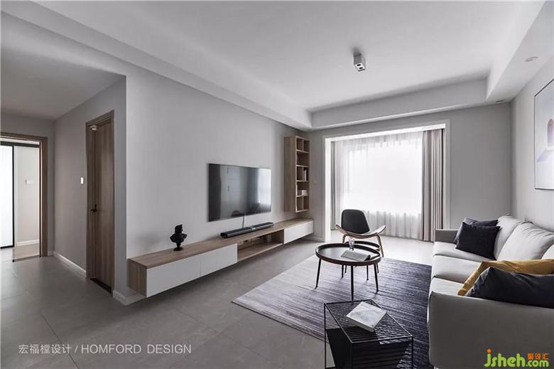 空間采用無主燈設計,客廳中央上方有一處明裝射燈,可自由調節(jié)照射角度。