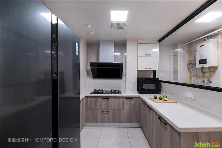 原廚房面積局促,裝修設計利用生活陽臺增大面積后寬敞舒適。滿足大型家電的擺放后,一家人同時在這里忙碌都不會顯得擁擠。