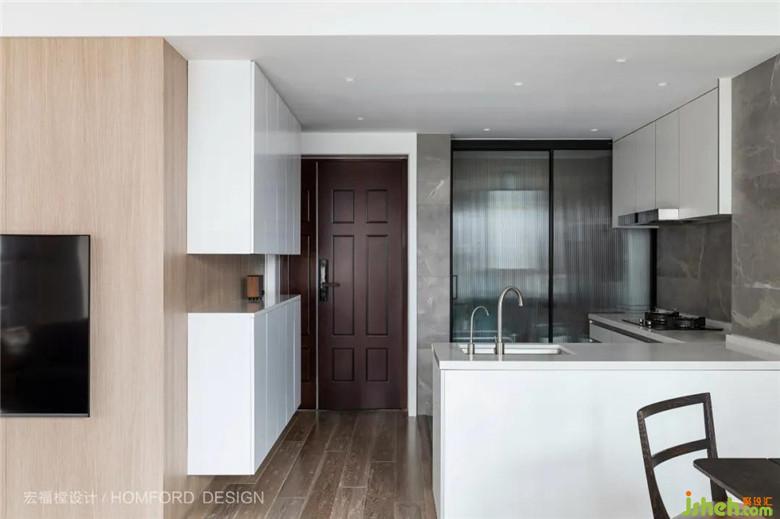 進(jìn)門玄關(guān)處鞋柜做了中部鏤空設(shè)計(jì)底部進(jìn)行懸空處理視覺通透,一眼望去給人以明快爽朗的空間感受。
