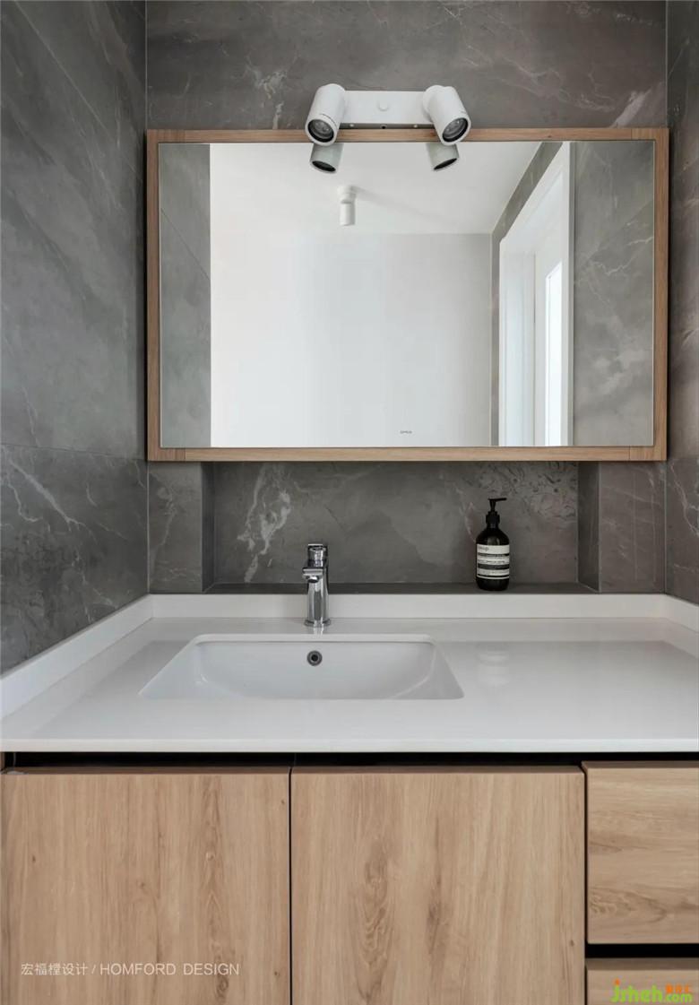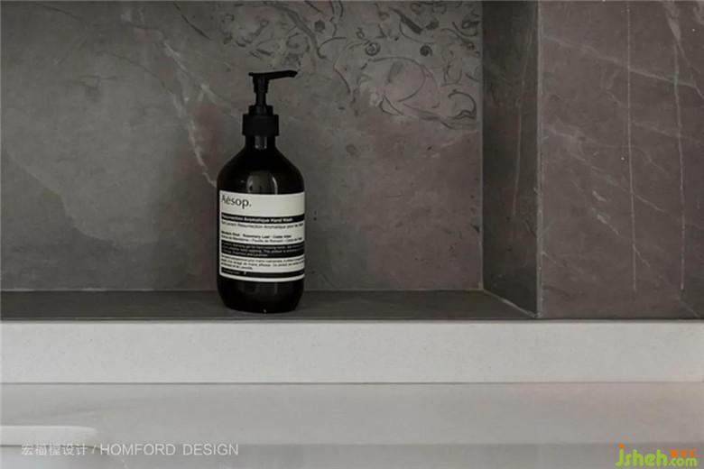 洗手臺細節(jié)處,我們利用墻體空間錯位設(shè)計出壁龕儲物,這樣直觀的設(shè)計簡化了拿取步驟,表達屋主一家“斷舍離”的生活狀態(tài)。