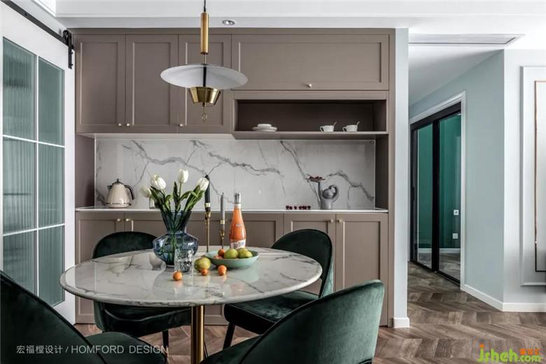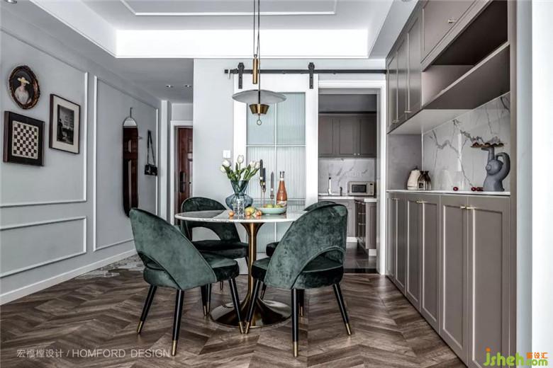 墨綠絲絨餐椅搭配簡約金屬吊燈在與客廳氛圍相融合,也以輕奢感塑造了每天的用餐儀式感。