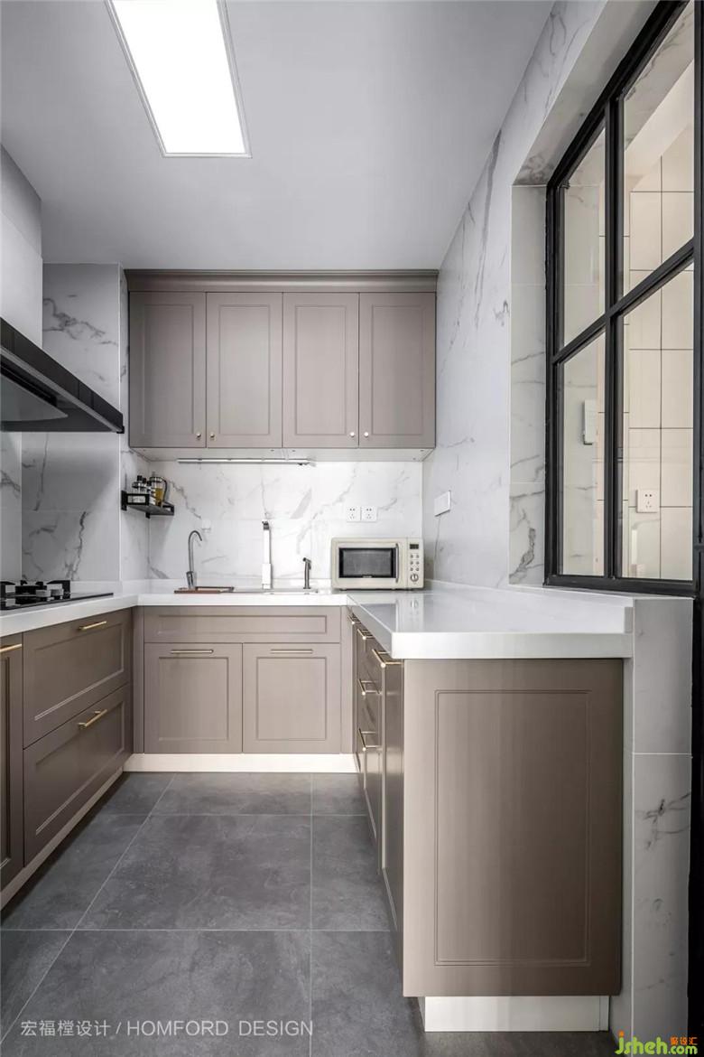 中廚與備餐臺相互融合呼應(yīng),灰咖色搭配大理石貼磚,身在倍感舒適與放松的空間里,做出的飯菜也必定可口美味。