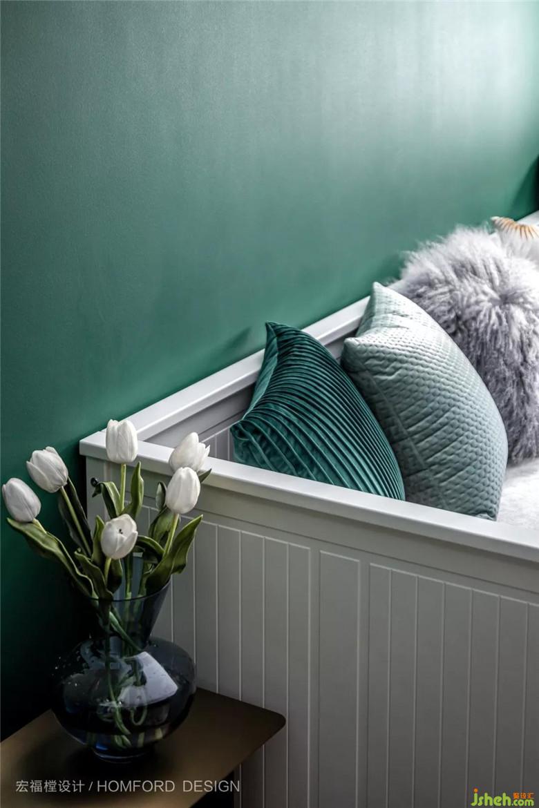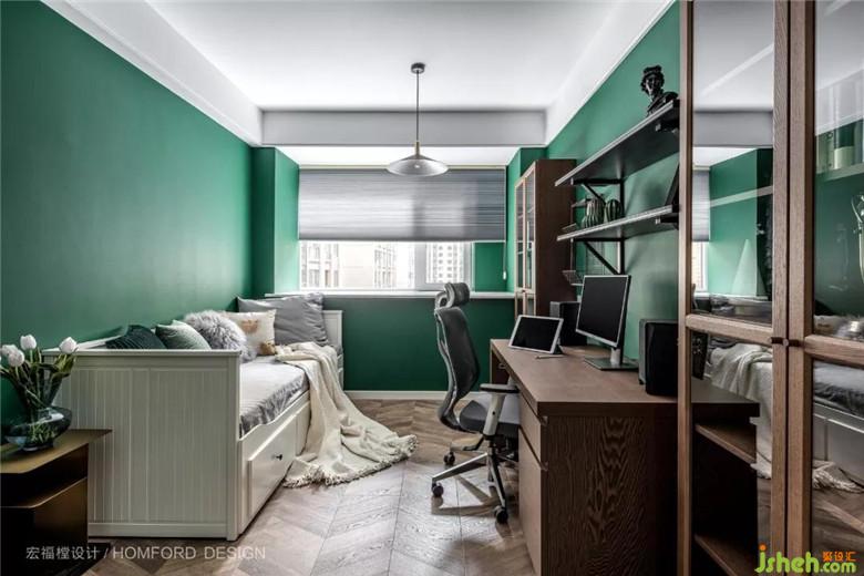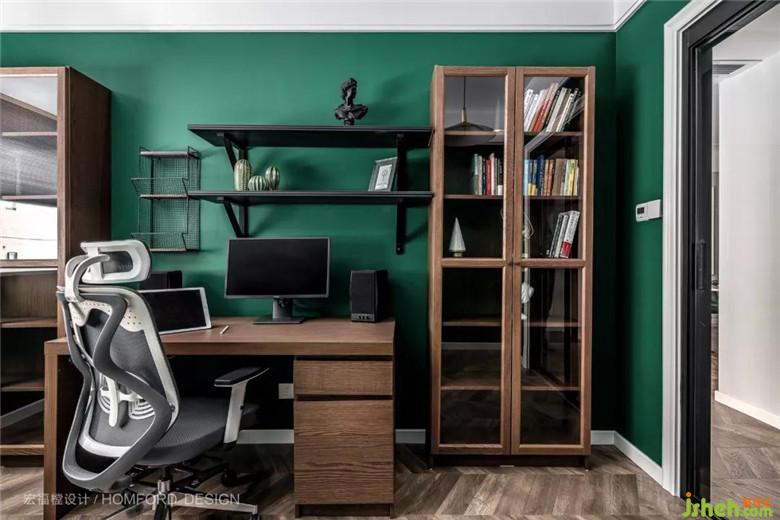 書房使用的大面積墨綠讓男屋主可以不受打擾的遨游在自己喜愛的色彩世界里,去掉金屬元素改用原木色書柜搭配也讓整個環(huán)境仿佛置身于清新的大自然中。