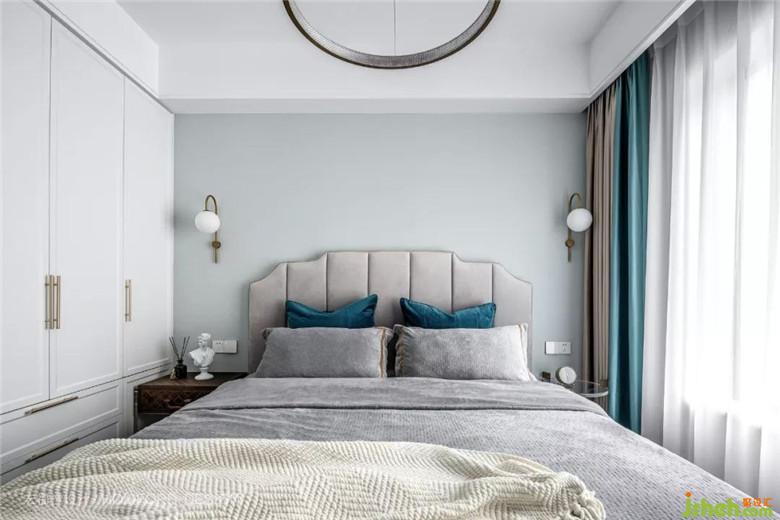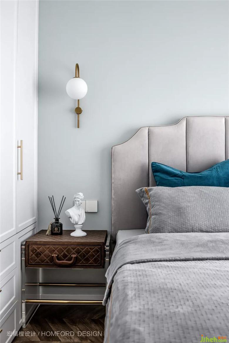 良好的采光讓以白色為主的臥室更通透和沁人心脾,延續(xù)客廳的絲絨與金屬搭配風格又進一步做了減法,在保持輕奢質(zhì)感的前提下讓人感覺更加舒適。