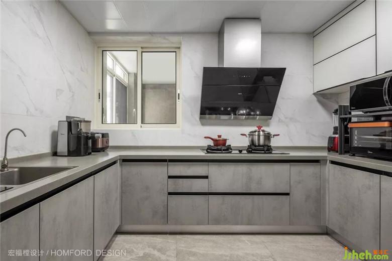 原廚房面積局促且因煤氣設(shè)備問題無法改動(dòng),為盡可能爭(zhēng)取使用空間,我們封閉了原生活陽(yáng)臺(tái)入口(現(xiàn)窗戶位置)擴(kuò)大了約1.6m地柜面積。
