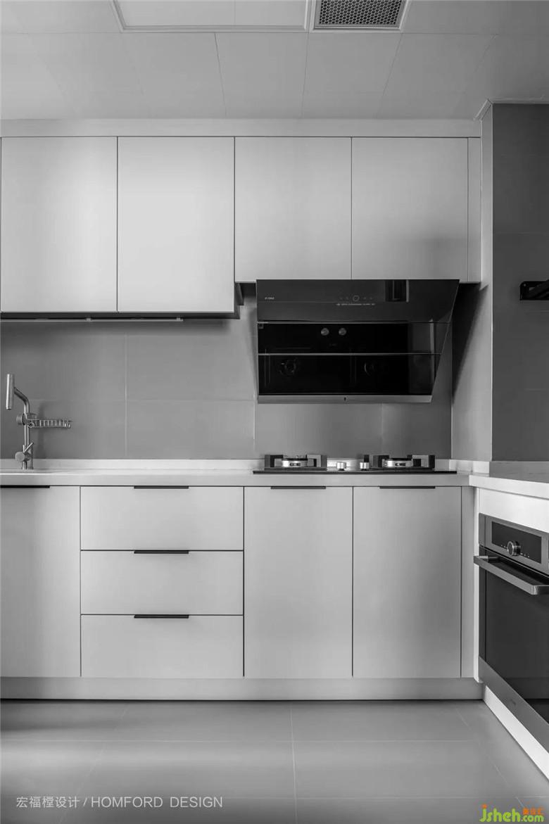 極窄黑框推拉玻璃門(mén)后是人間煙火氣,廚房整體黑白分明,寬敞明亮。借用小小2.5㎡陽(yáng)臺(tái)空間,讓使用舒適度翻番。