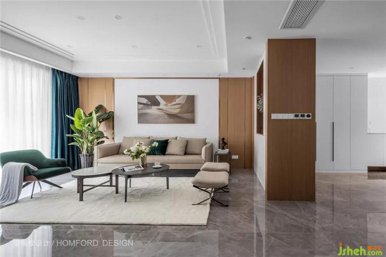 客廳采用無主燈設(shè)計(jì),動線流暢,大方簡潔而又不失現(xiàn)代時尚感。沙發(fā)墻與沙發(fā)色系統(tǒng)一,在視覺上營造出充滿藝術(shù)張力的美術(shù)效果。