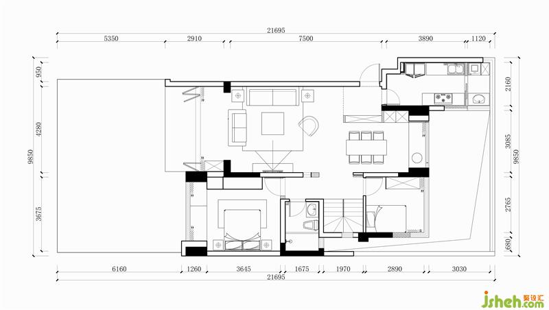 原玄關(guān)右側(cè)為樓梯,從使用舒適度和美觀性上都顯雞肋。于是我們將正對(duì)玄關(guān)側(cè)方的次衛(wèi)改成了樓梯間入口。無論從訪客還是居住者本人的空間活動(dòng)路徑來講都更加合理,客餐廳廚房為公區(qū),以樓梯為界,兩側(cè)臥房為私區(qū),公私分區(qū)動(dòng)靜明確。