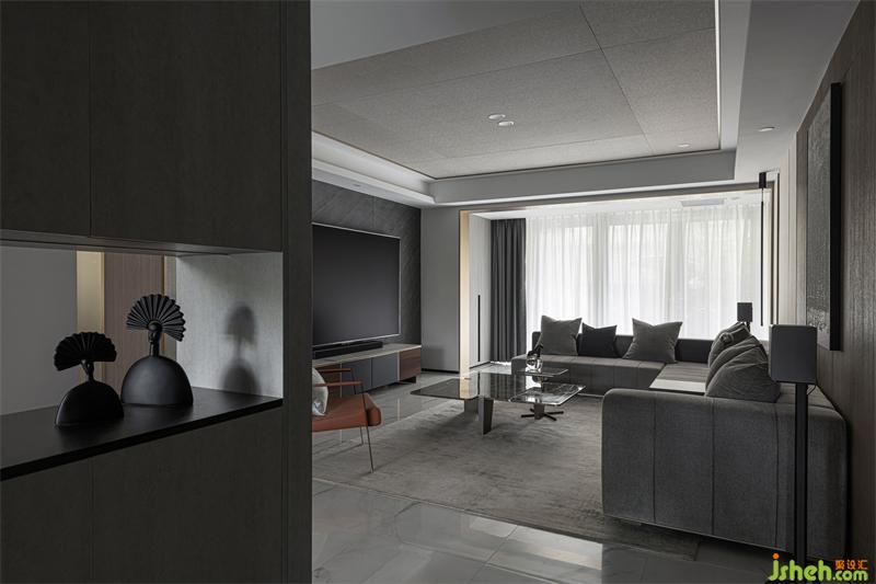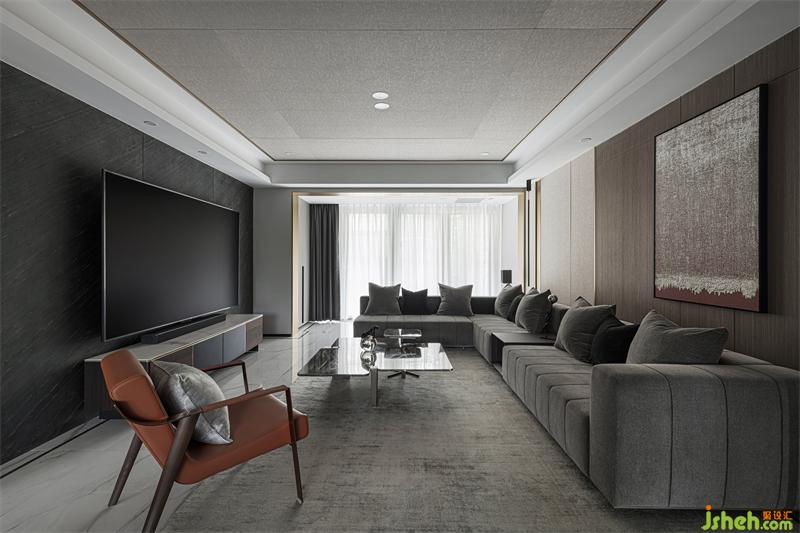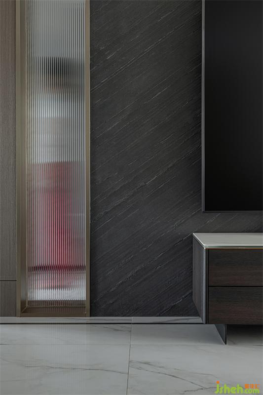 我們調(diào)整樓梯布局后客廳空間得以釋放,增加電視墻橫向尺寸,完美解決了原結(jié)構(gòu)兩面背景墻的比例分割不合理問題。確保比例協(xié)調(diào)再利用長虹玻璃獨(dú)有的透光性,營造出若影若現(xiàn)的穿透效果。