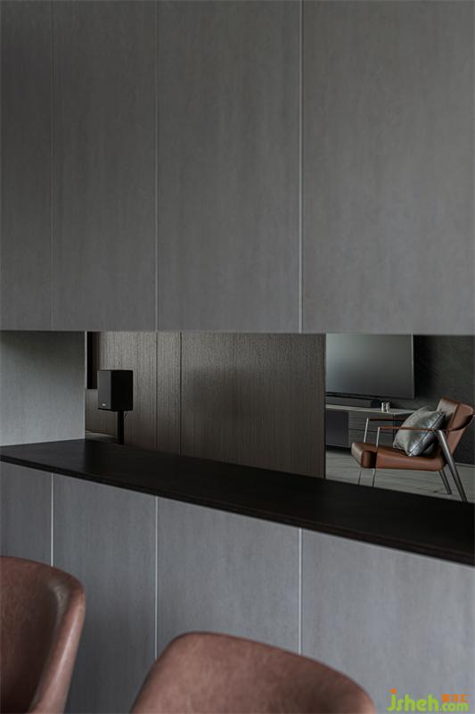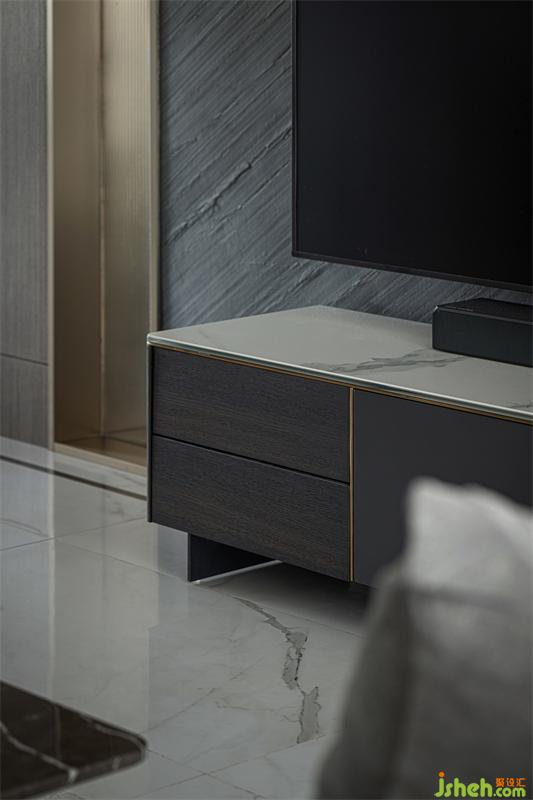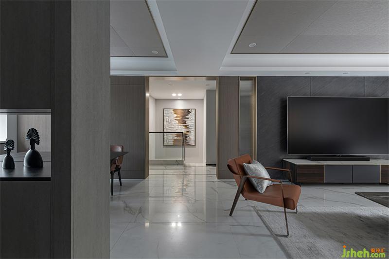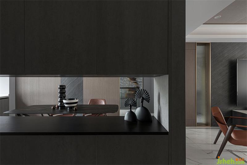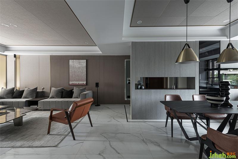 飾面材質(zhì)貫穿整個(gè)客餐廳空間,各區(qū)域相互呼應(yīng)同時(shí)保有相對(duì)獨(dú)立性,石材、金屬材質(zhì)的穿插,讓原本乏味的空間更具律動(dòng)感與趣味性。