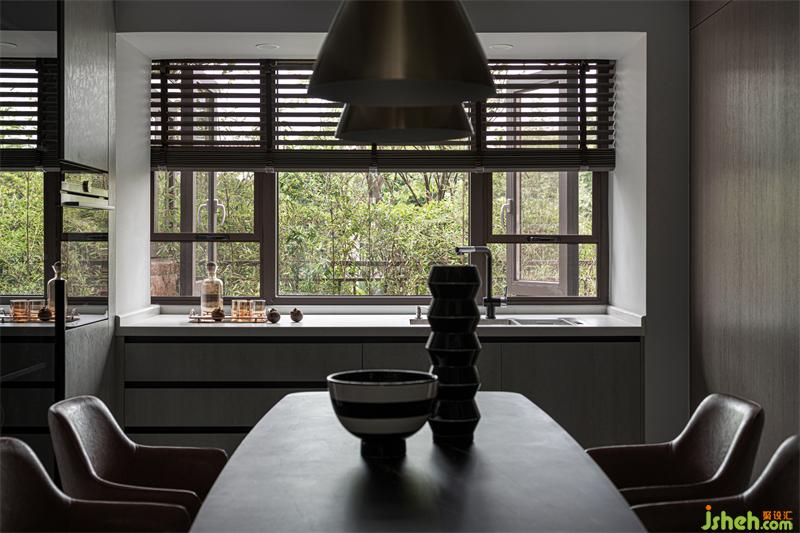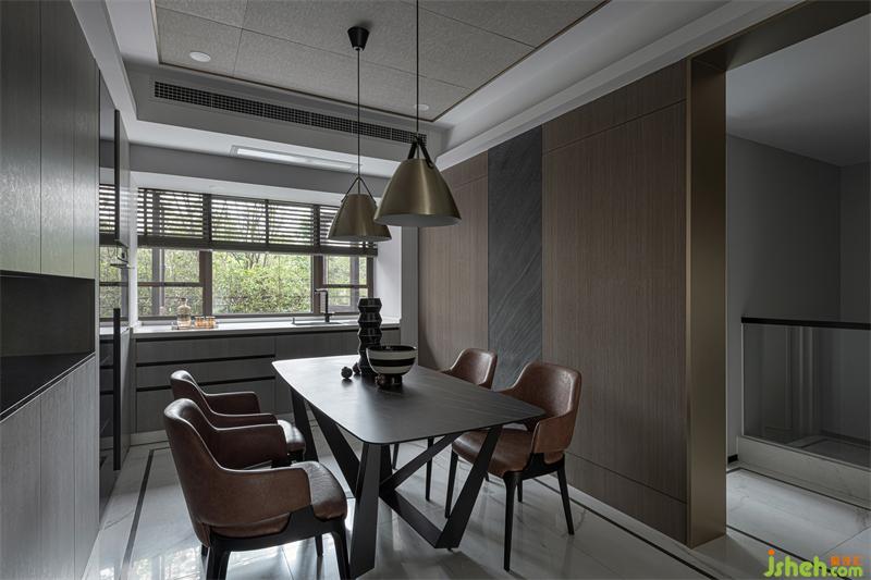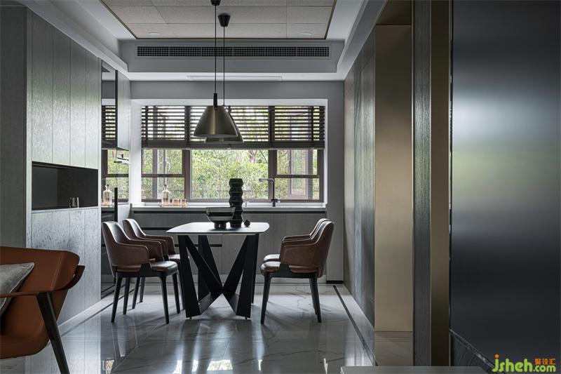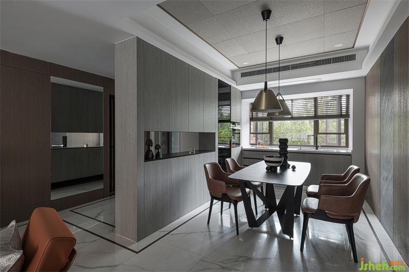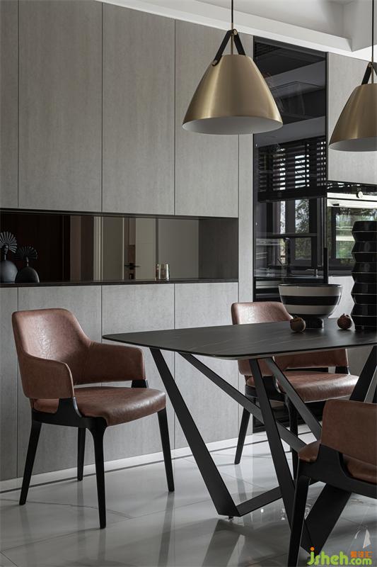 餐廳空間我們去繁就簡無多余修飾,與客廳同材質的飾面板、金屬、大理石運用讓兩個空間從質感與色調保持一致性。