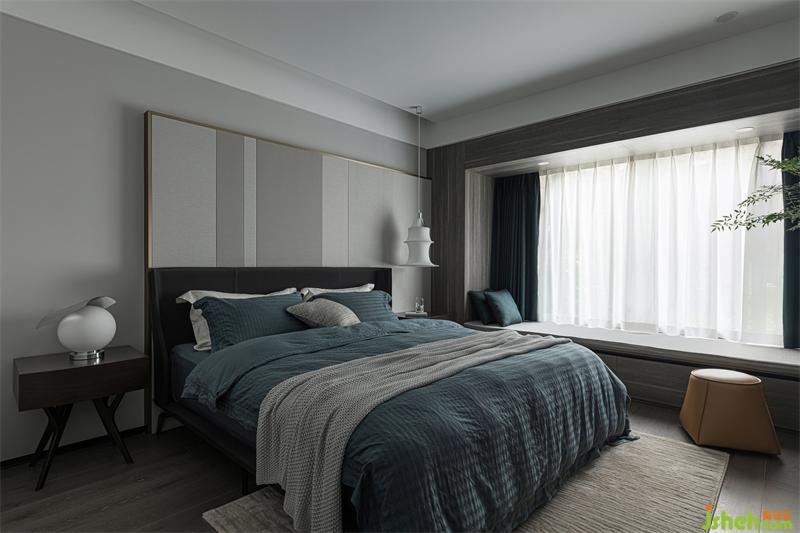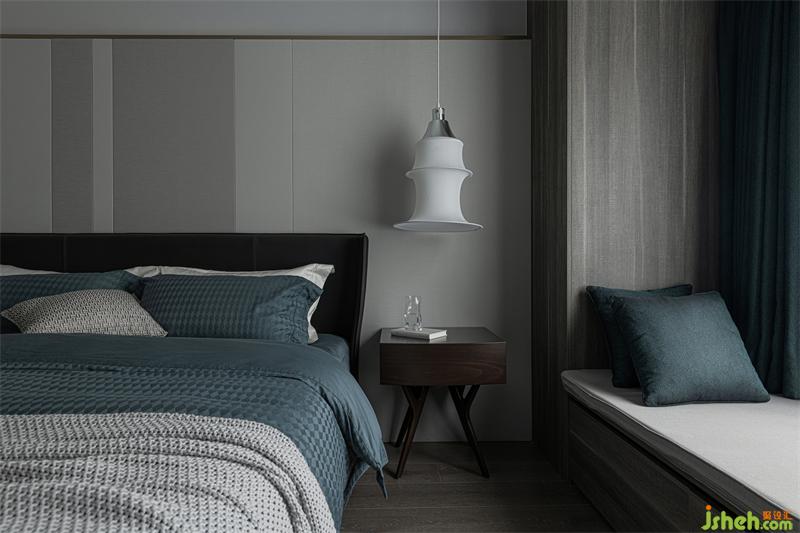 因原結構限制主臥面積略顯局促,我們采用非對稱設計手法切割床頭背景墻。當視線被集中吸引到床后背景時,受豎向線條不規(guī)則拼接硬包立體造型影響產生縱向拉伸錯覺,擴大整個空間視覺感。