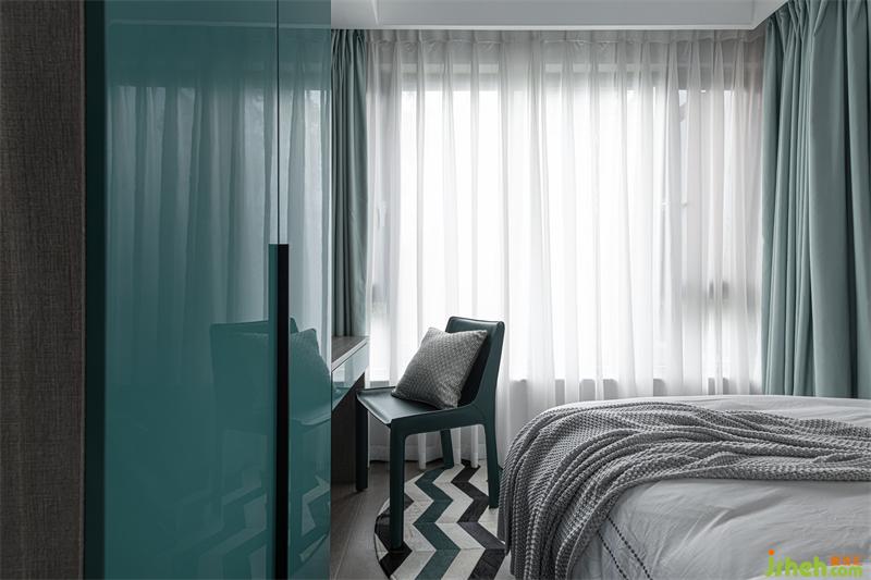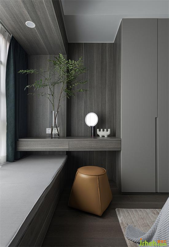 在有限的空間內,我們巧妙的借用飄窗距離延伸梳妝臺長度,以滿足更多的妝臺使用面積。