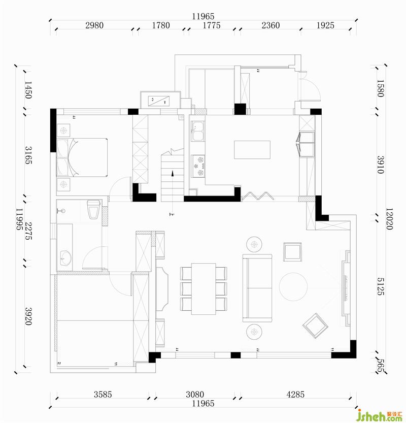 原戶型為典型豎廳格局,廚房面積局促,無(wú)法滿足他倆對(duì)使用感的訴求。于是我們進(jìn)行了大刀闊斧的改造,將餐廳納入廚房整體廚房面積擴(kuò)大1.5倍同時(shí)具備中西廚兩種功能,將原客房納入客廳原客廳由豎廳變?yōu)闄M廳,兩面落地窗使得采光翻倍空間更具通透性。改造后,需經(jīng)過(guò)廚房再進(jìn)入客餐廳。