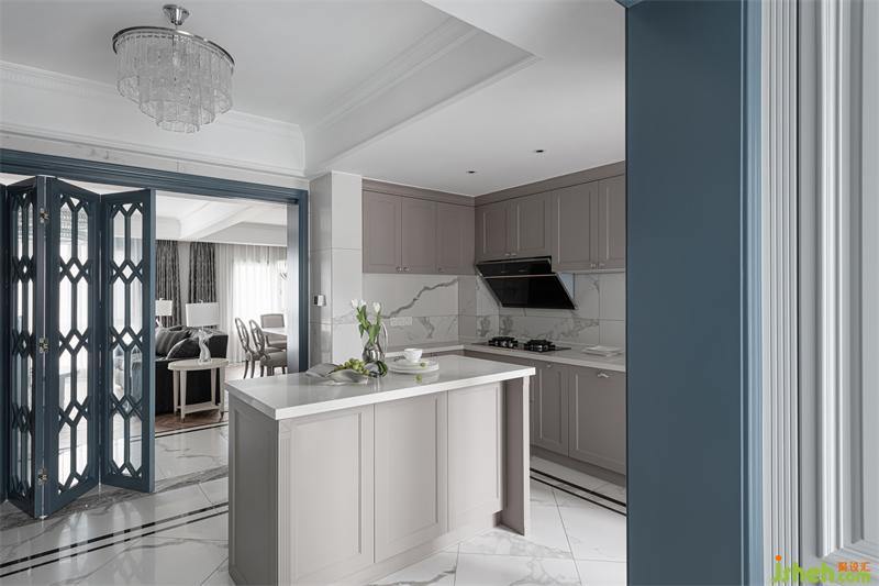 別墅設(shè)計(jì)考慮到全開(kāi)放跑煙問(wèn)題,我們選擇了無(wú)地軌的上吊玻璃折疊門進(jìn)行分區(qū)。日常折疊收起,廚房客餐廳全開(kāi)放保持LDK一體化展示;做飯時(shí),推拉關(guān)閉非常方便。深灰藍(lán)鏤空造型時(shí)尚復(fù)古,玻璃夾層采光通透,可變型的折疊門將空間切割,形成既開(kāi)放又獨(dú)立的共存關(guān)系。