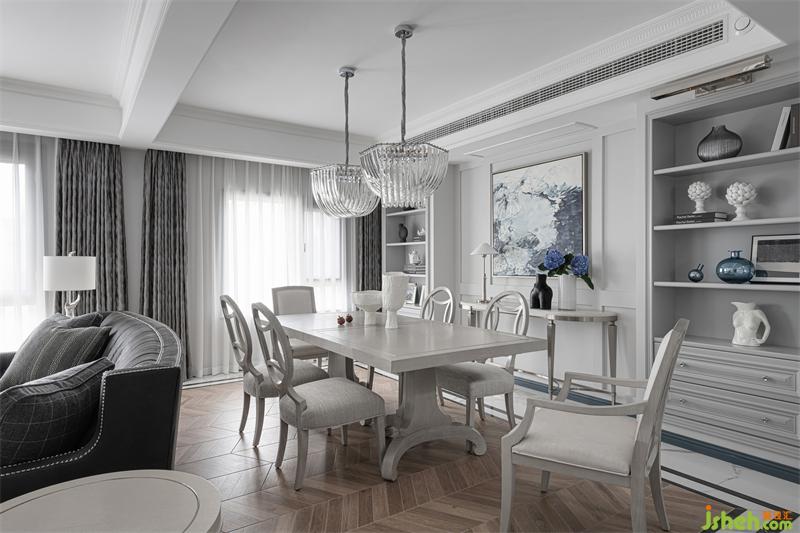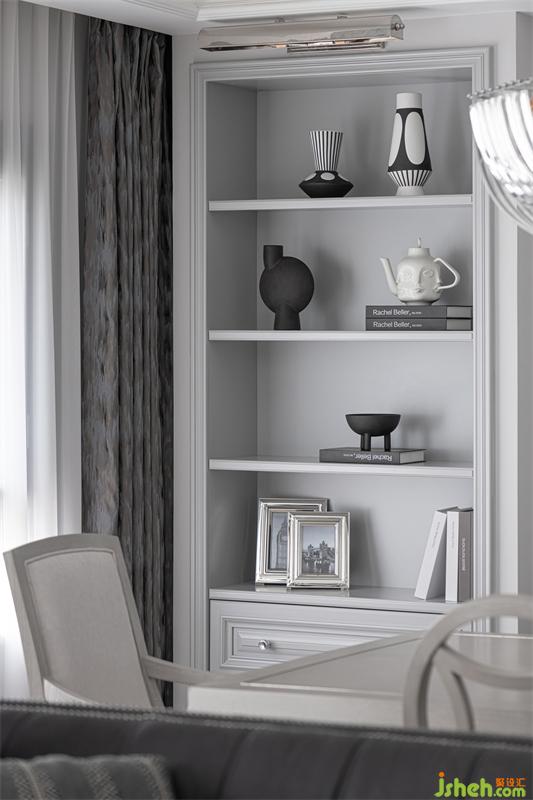 客房納入客廳后由原豎廳變?yōu)闄M廳,兩面落地窗使得采光翻倍空間更具通透性。客餐廳利用頂部及家具進(jìn)行三段式布局,2/3的大面積空間留給客廳,1/3沙發(fā)后的餐廳區(qū),餐廳背景墻對(duì)稱嵌入式高柜用以裝飾點(diǎn)綴同時(shí)兼具一定收納功能。