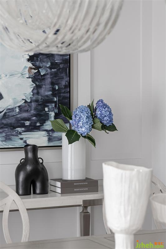 對(duì)稱感在餐廳的硬裝部分得到淋漓盡致的展示,旅行中的戰(zhàn)利品通過(guò)非對(duì)稱的方式進(jìn)行陳列,讓空間平添一份活潑、靈動(dòng)。藍(lán)色繡球與主掛畫相得益彰,女屋主對(duì)花材的喜愛(ài)在這里得以體現(xiàn),環(huán)境所創(chuàng)造的場(chǎng)景與他們的生活習(xí)慣密切相連。