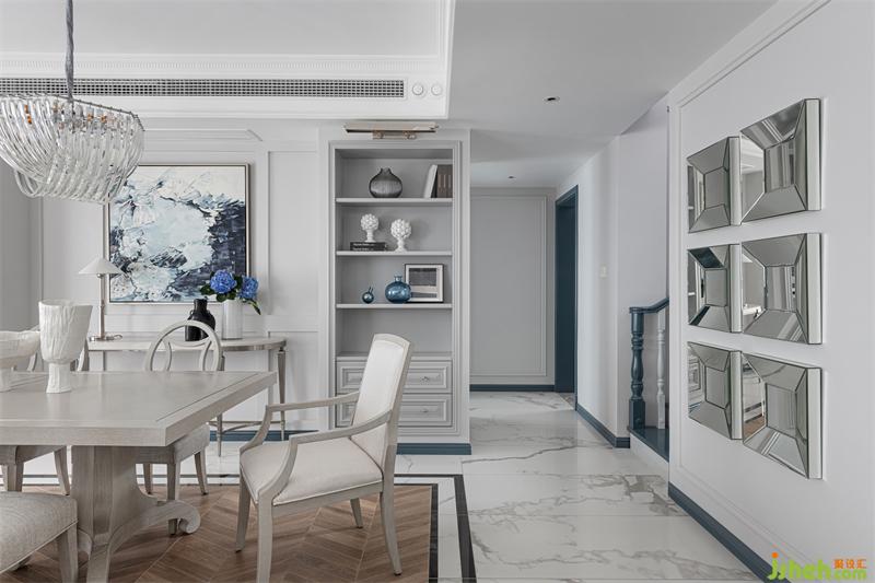 我們通過(guò)近半個(gè)月的家訪了解屋主之前的生活方式、興趣愛(ài)好,圍繞著他們獨(dú)有的一半旅行一半居家的狀態(tài)延展,提煉出關(guān)鍵詞“開(kāi)放性”“儀式感”。僅兩人使用的空間實(shí)在不必碎片化分區(qū),于是我們將空間全部“打開(kāi)”讓偶爾接待訪客一起使用的公區(qū)通透寬闊更具互動(dòng)性,同時(shí)客房預(yù)留在一樓以備不時(shí)之需,而不想被打擾的私密空間設(shè)定在二樓更具隱私性。整屋穿插使用實(shí)木、大理石材、金屬、玻璃,融合低調(diào)內(nèi)斂的藍(lán)、白、灰作為空間主色調(diào)寧?kù)o、雅致,營(yíng)造高級(jí)雅致的空間氛圍。