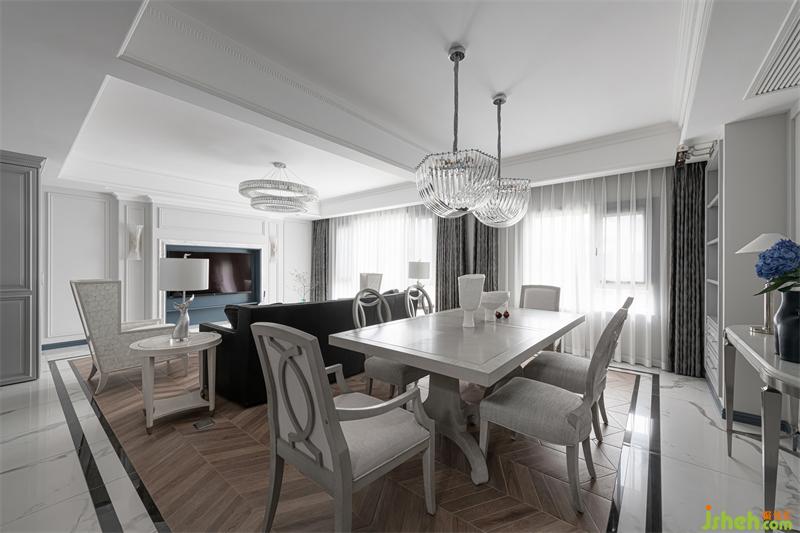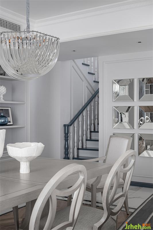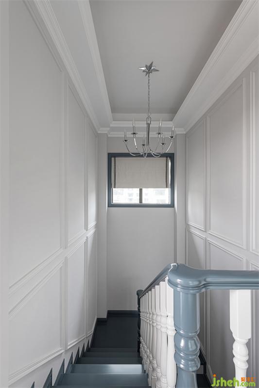 在樓梯側(cè)面,我們設(shè)置了一整排儲物間用來堆放清潔用品、行李箱等,因其沿用與走廊樓梯一致的裝飾線條藏而不露。模擬天井的邊頂造型貫穿全屋從一樓至二樓延伸,銀質(zhì)復古蠟燭吊燈優(yōu)雅大氣成為點睛之筆。