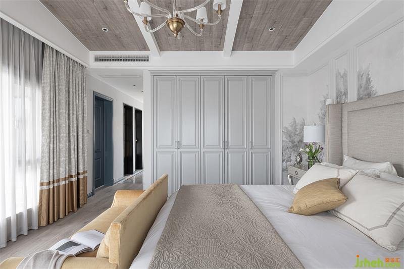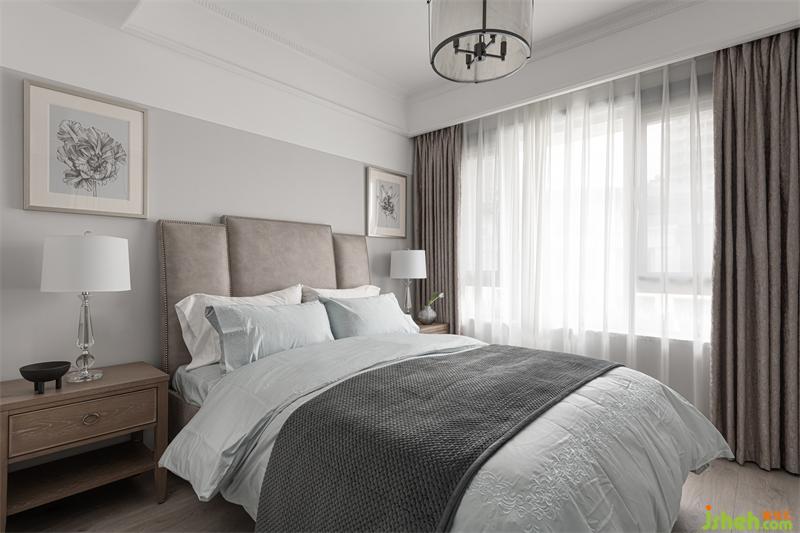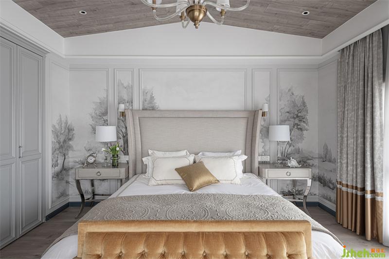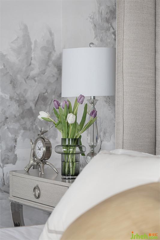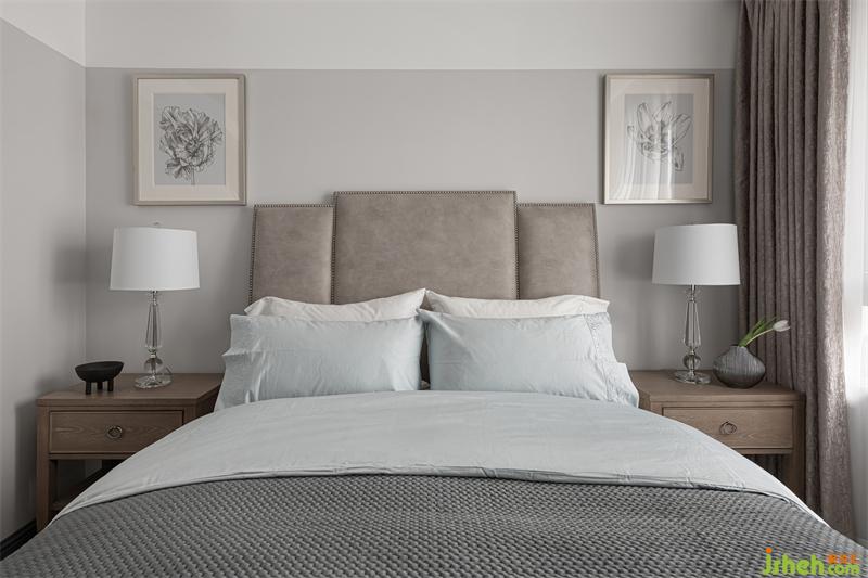 低調(diào)溫和的冰川灰作為臥室的墻面基調(diào),并進行400mm的分色處理,讓空間更具層次感。鉚釘軟包床、藝術(shù)掛畫、玻璃臺燈、木質(zhì)床頭柜,形成現(xiàn)代與美式古典家居相融的舒適氛圍。