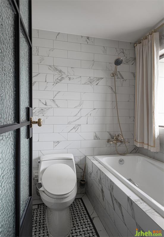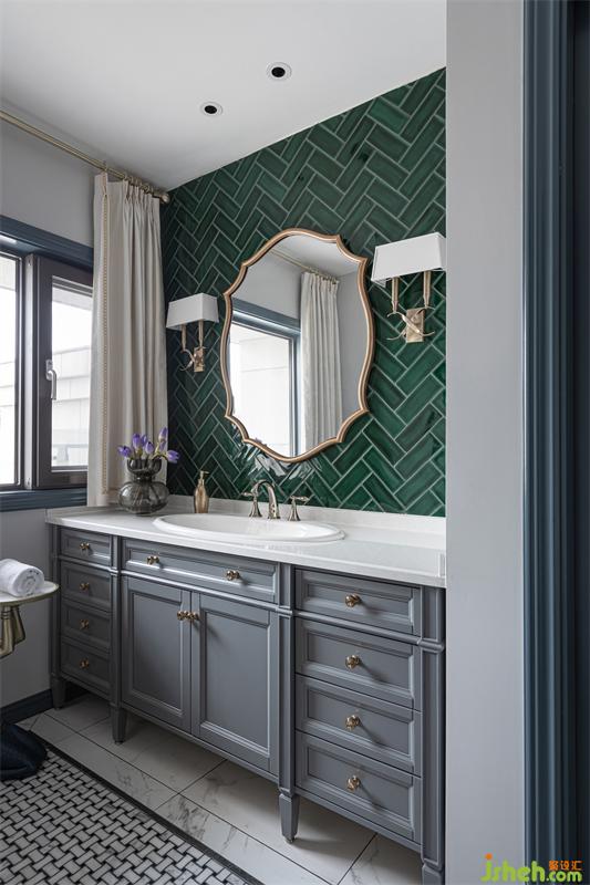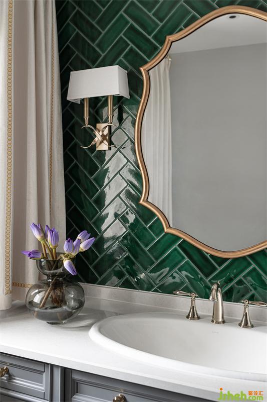 黑白的編織紋地磚是步入衛(wèi)生間的第一份儀式感, 精致巧妙的復古造型面鏡與典雅的翡翠綠人字拼瓷磚進行搭配,經(jīng)典與摩登交融其中,是能夠體會、觸碰得到的柔情蜜意。
