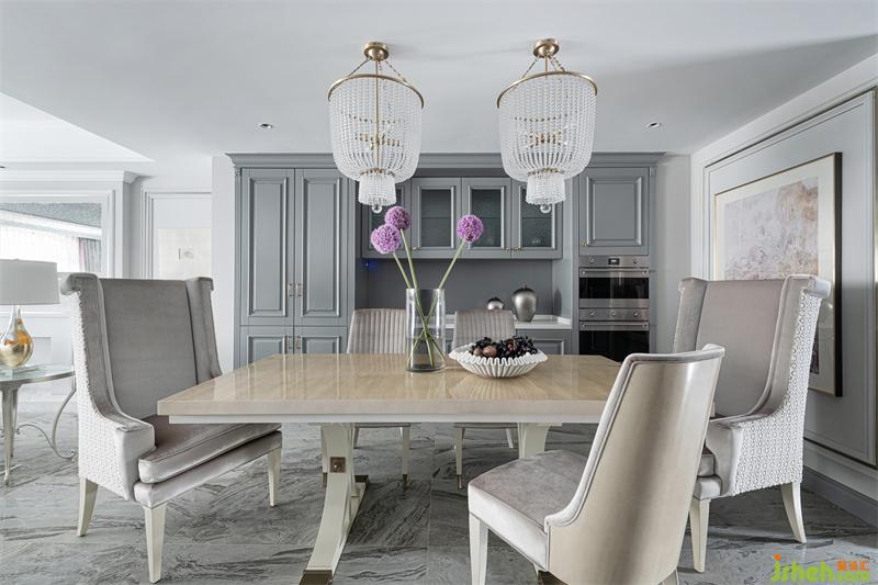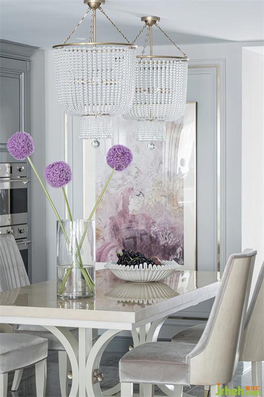 水晶吊燈與有弧度造型的餐椅賦予空間動(dòng)態(tài)的韻律與美感,淡紫色金屬邊框掛畫(huà)散發(fā)出浪漫清新的氣息,準(zhǔn)確描摹出屋主的雅貴氣質(zhì)和平日里自在的生活狀態(tài)。
