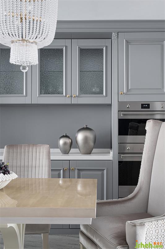 由于原廚房面積有限我們將西廚功能移至餐廳,烘焙、下午茶、拿取干貨等動(dòng)作變得一氣呵成,避免了往返廚房餐廳的重復(fù)動(dòng)線。空間整體以素雅淡色為基調(diào),深受上世紀(jì)末美國(guó)上流社會(huì)喜愛(ài)的香芋紫作為點(diǎn)綴色用以跳色,以優(yōu)雅精致的姿態(tài)躍然而出。