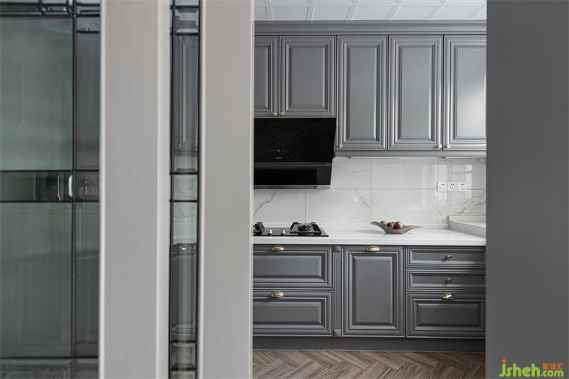 獨(dú)特藝術(shù)元素玻璃門(mén)后是寬敞的廚房空間,米白大理石瓷磚、暖灰噴漆線條門(mén)板、淺棕魚(yú)骨拼瓷磚,延續(xù)了與客餐廳的一致調(diào)性。在實(shí)用基礎(chǔ)上簡(jiǎn)潔優(yōu)雅的配色使空間視野更顯開(kāi)闊,吊柜與地柜拉手的細(xì)致區(qū)分,體現(xiàn)了一個(gè)設(shè)計(jì)師對(duì)細(xì)節(jié)的極致追求。